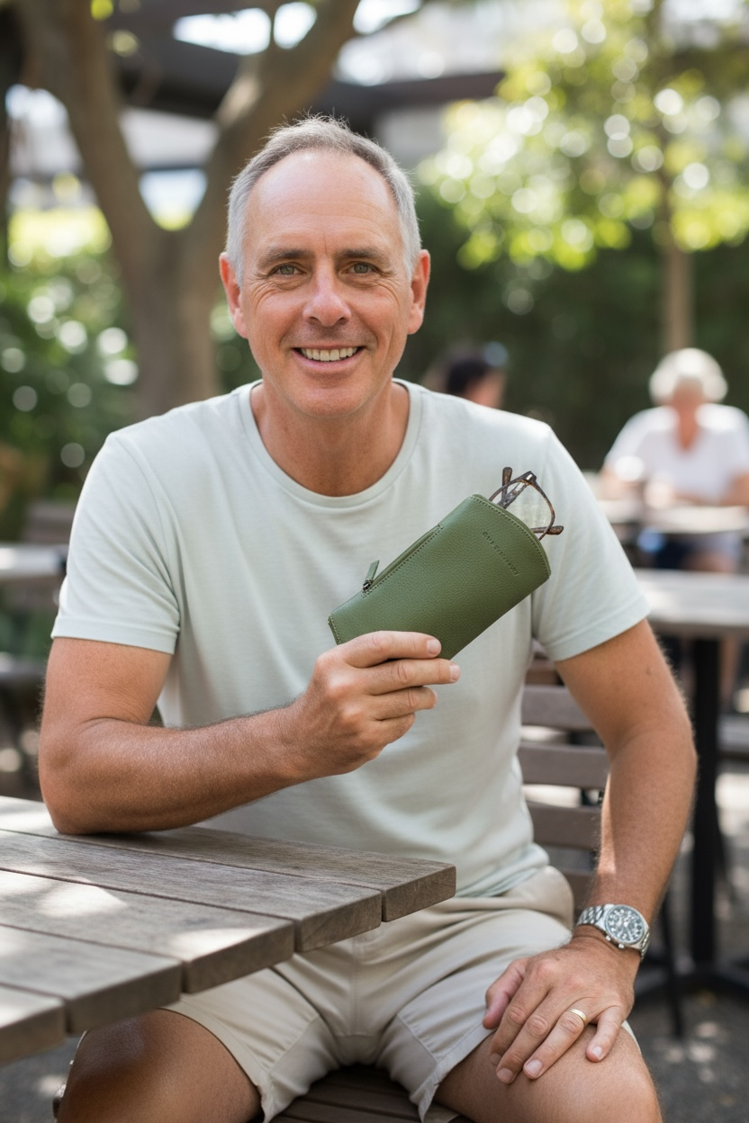 Holds two pairs separately and stylishly BLACK, TOBACCO, CAMEL, PISTACHIO leather .