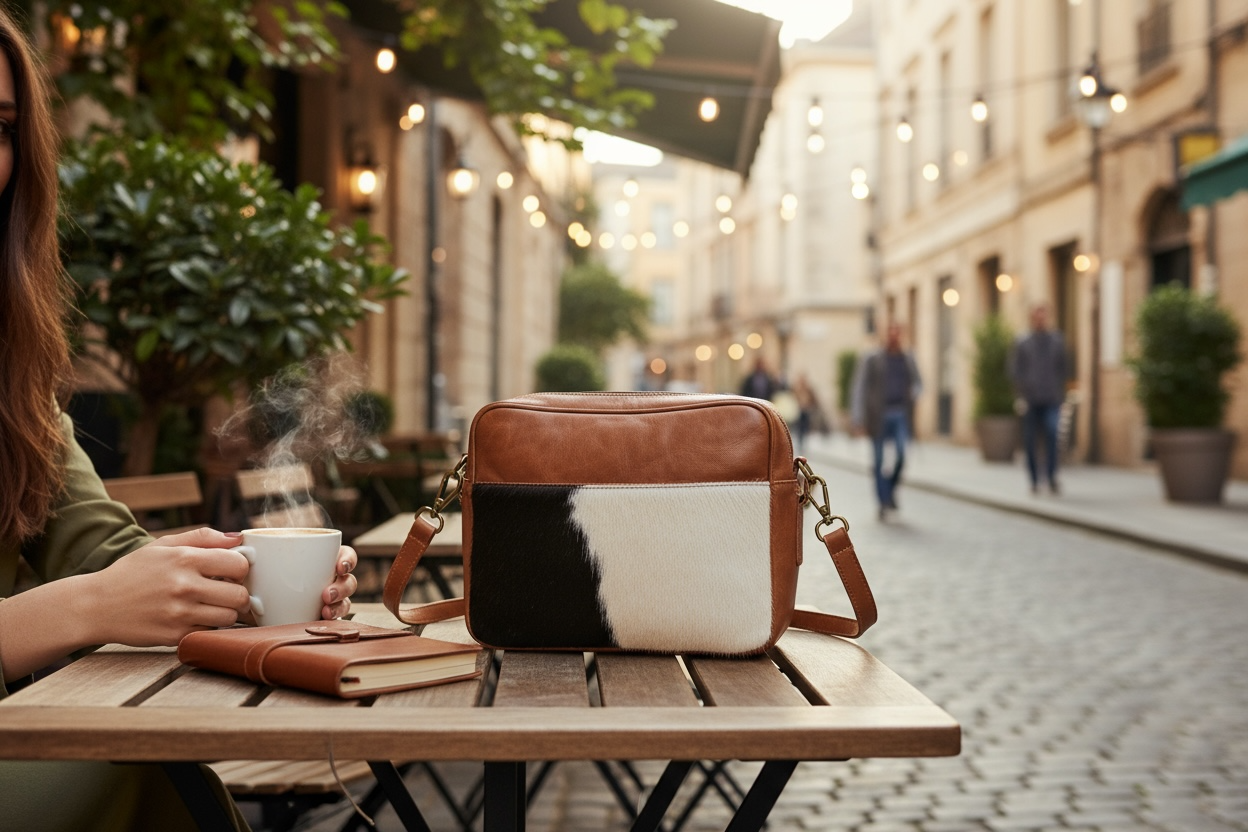 On trend retro camera bag shape, cow hide feature on the front pocket.
